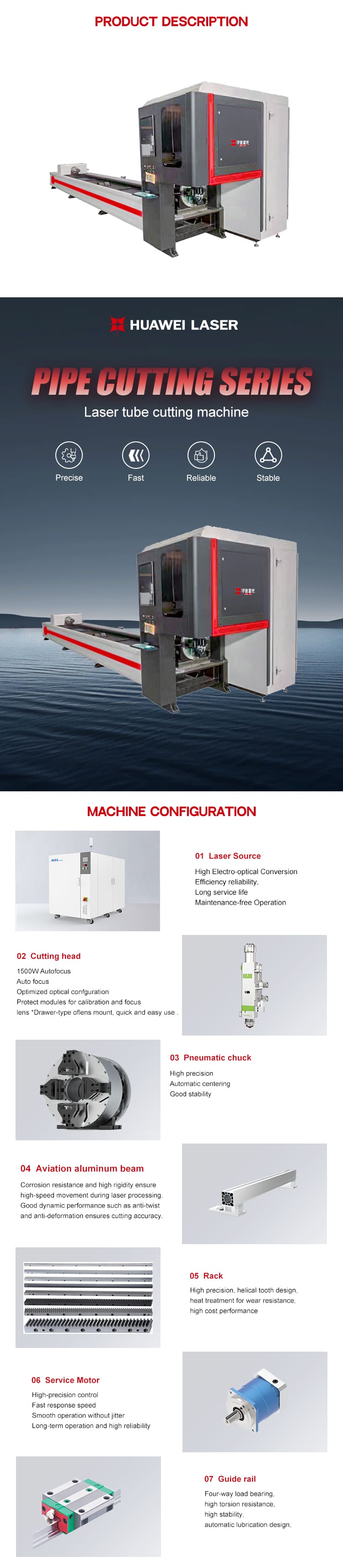 The HUAWEI LASER 6000W High-precision Double-Chucks Tube Fiber Laser Cutting Machine is designed for efficient and accurate processing of round, square, and irregular metal tubes. Its dual-chuck system ensures stable clamping, minimal vibration, and precise rotation during high-speed cutting. Equipped with a high-performance fiber laser source and intelligent control software, it delivers clean cuts, smooth edges, and excellent repeatability. The HUAWEI LASER Double-Chucks Tube Fiber Laser Cutting Machine is an advanced Handheld Laser Welding Machine alternative designed specifically for high-efficiency tube and pipe processing. Equipped with dual pneumatic chucks, it ensures stable clamping, automatic centering, and precise rotation for smooth, accurate cuts on round, square, and irregular metal tubes. Its high-power fiber laser source delivers fast cutting speed, clean edges, and minimal thermal deformation. Engineered for metal fabrication, furniture manufacturing, fitness equipment production, and automotive components, the HUAWEI LASER tube cutting system provides outstanding accuracy, reliability, and productivity for modern industrial applications.This machine supports automatic loading, optimized cutting paths, and fast material switching, making it ideal for furniture manufacturing, fitness equipment, construction pipes, and custom metal fabrication. It provides strong reliability and consistent productivity for tube-processing applications.